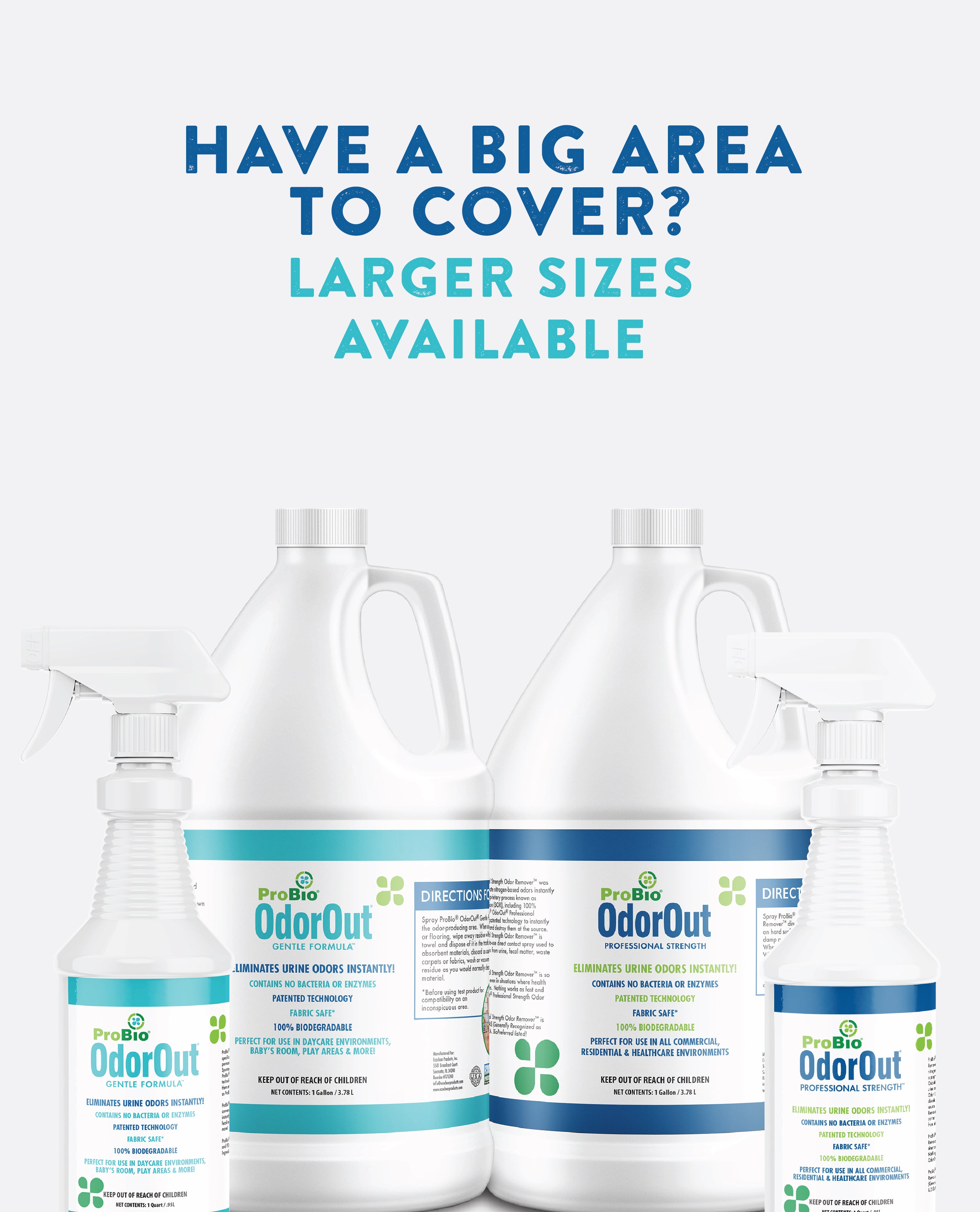 ProBio® OdorOut® Professional Strength Odor Remover™ is a safe and effective RTU (ready-to-use) spray that instantly and permanently neutralizes all nitrogen-based odors like urine or feces.