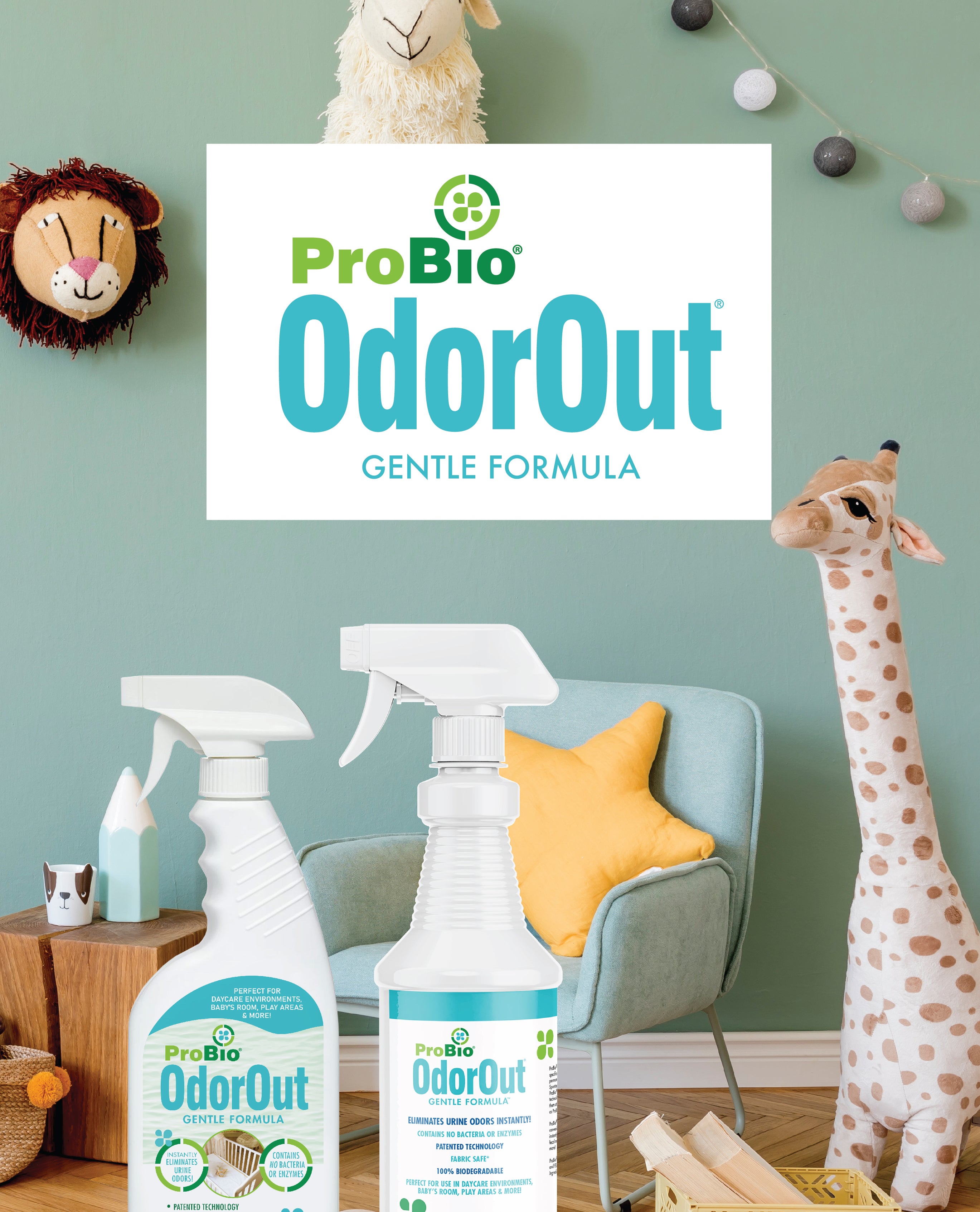 ProBio® OdorOut® Gentle™ is a safe and effective ready-to-use spray that instantly eliminates all nitrogen-based odors (like urine or feces), leaving a pleasant scent, even in diapers or waste containers. It uses a patented, proprietary process known as “Spontaneous Oxidation-Reduction” to destroy odor molecules at the source.