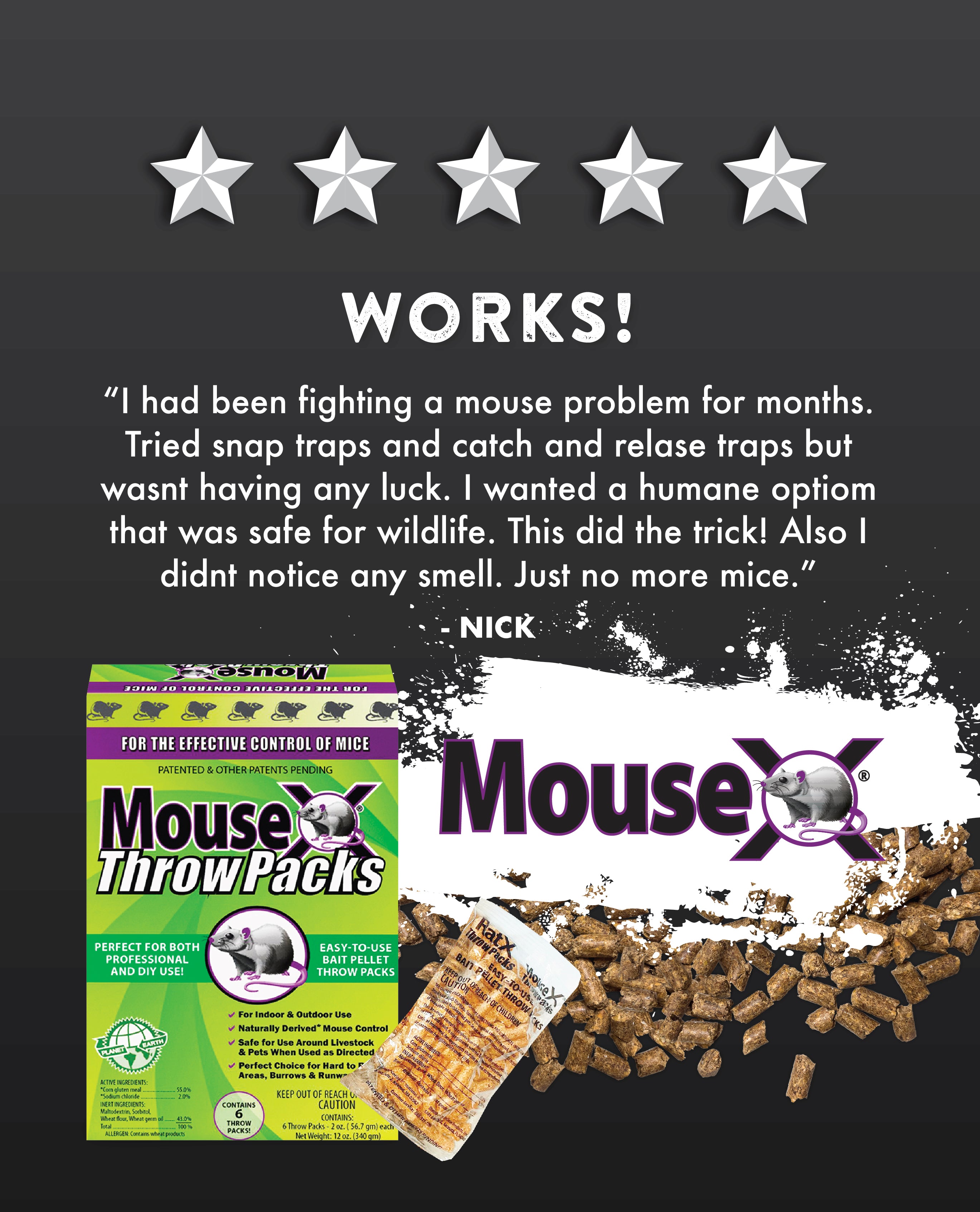 When used as directed, MouseX® Pellets are effective for indoor and outdoor mouse and rat control, even safe for use around cats, dogs, and children.