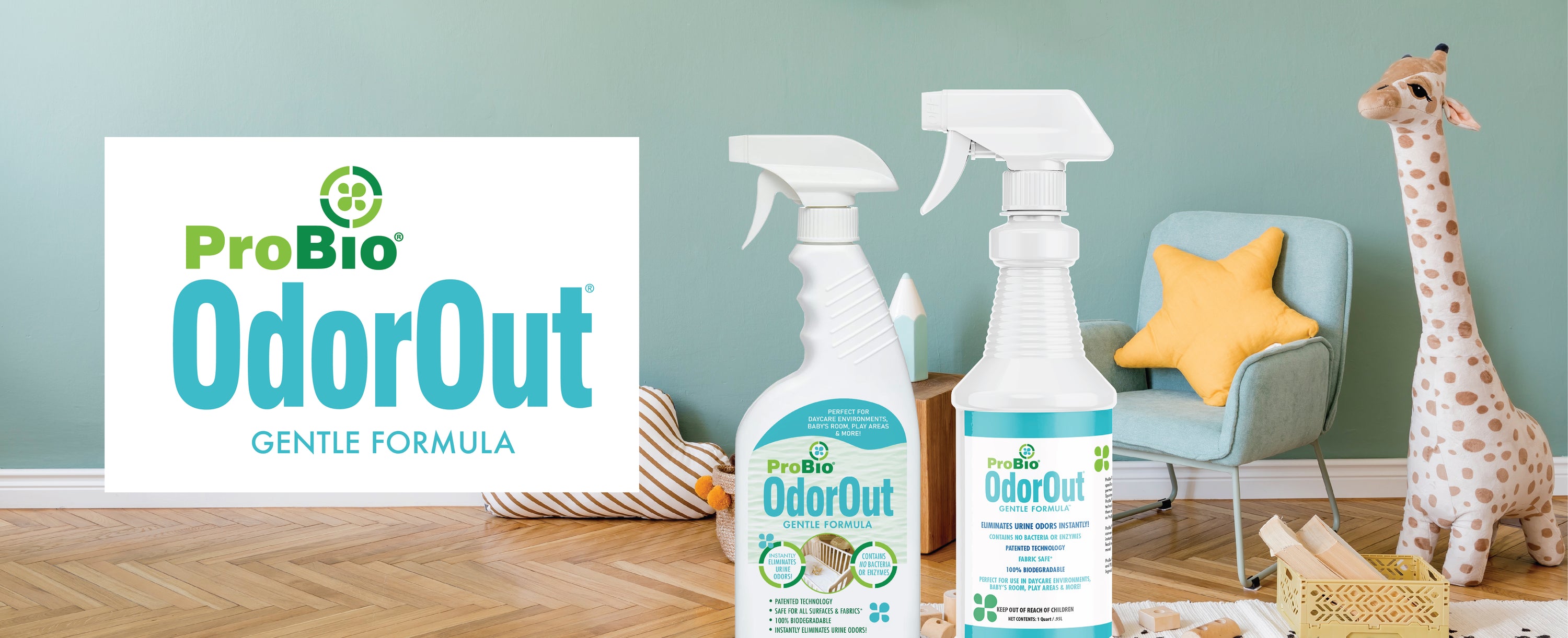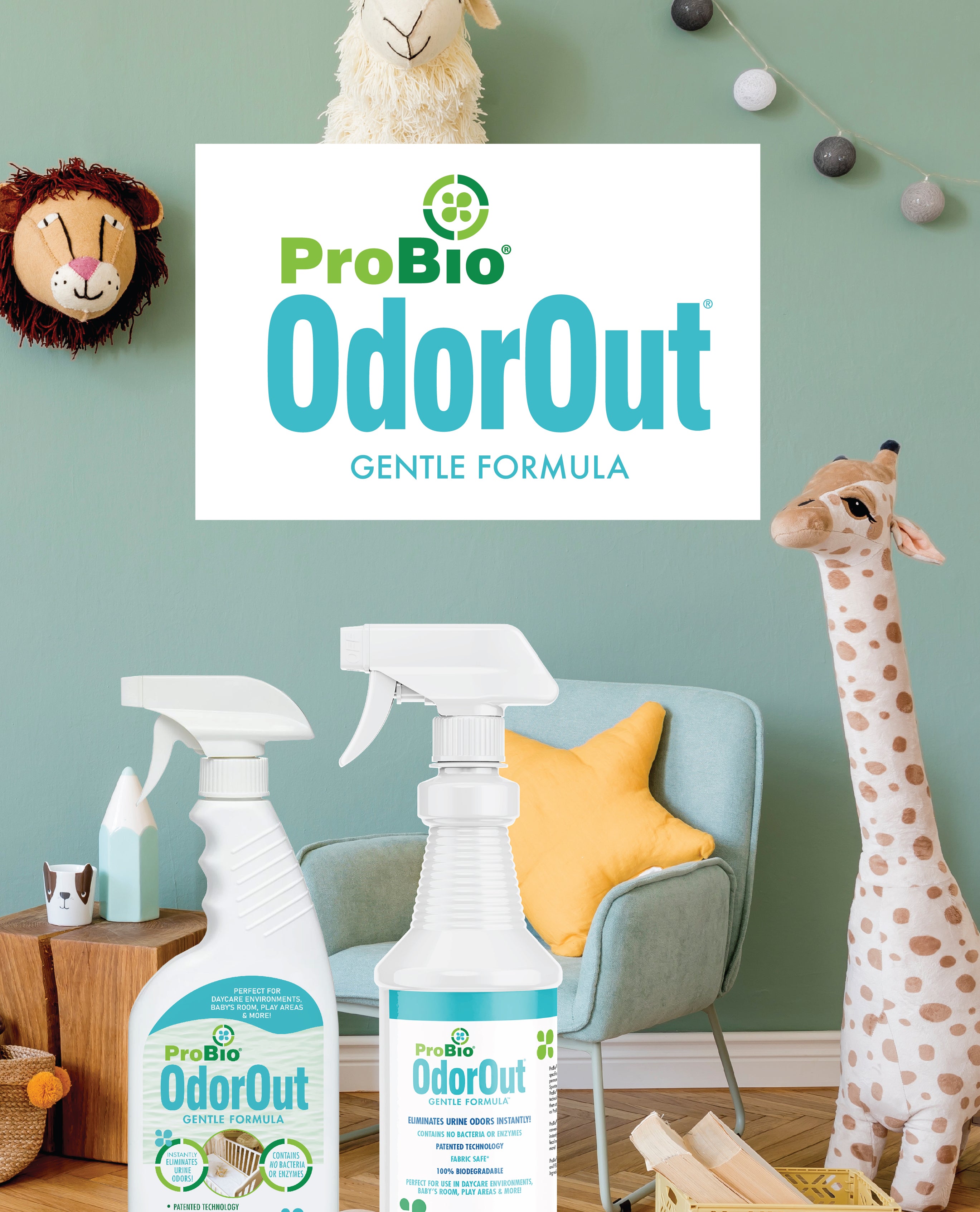 ProBio® OdorOut® Gentle™ is a safe and effective ready-to-use spray that instantly eliminates all nitrogen-based odors (like urine or feces), leaving a pleasant scent, even in diapers or waste containers. It uses a patented, proprietary process known as “Spontaneous Oxidation-Reduction” to destroy odor molecules at the source.
