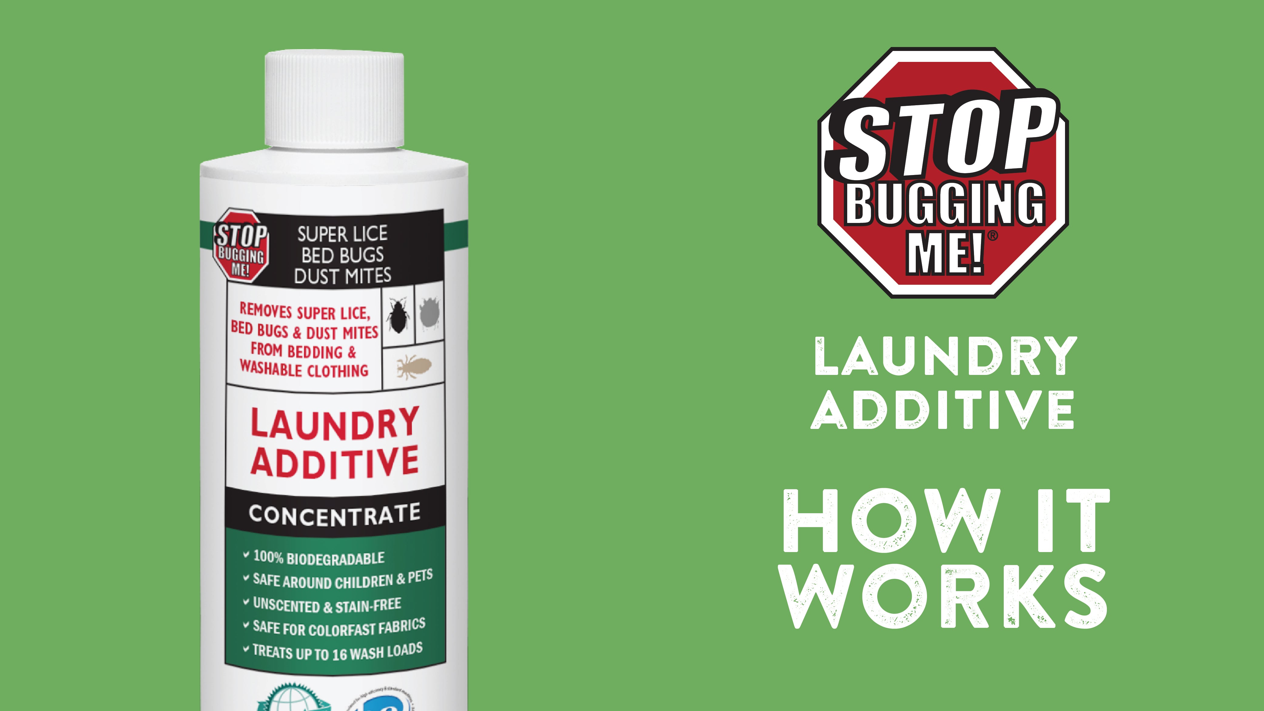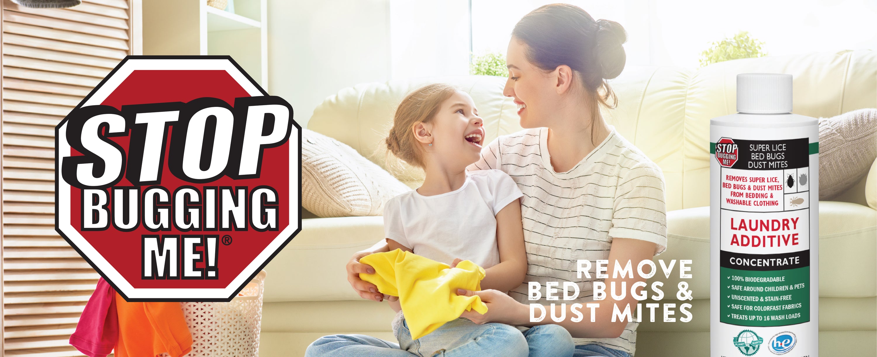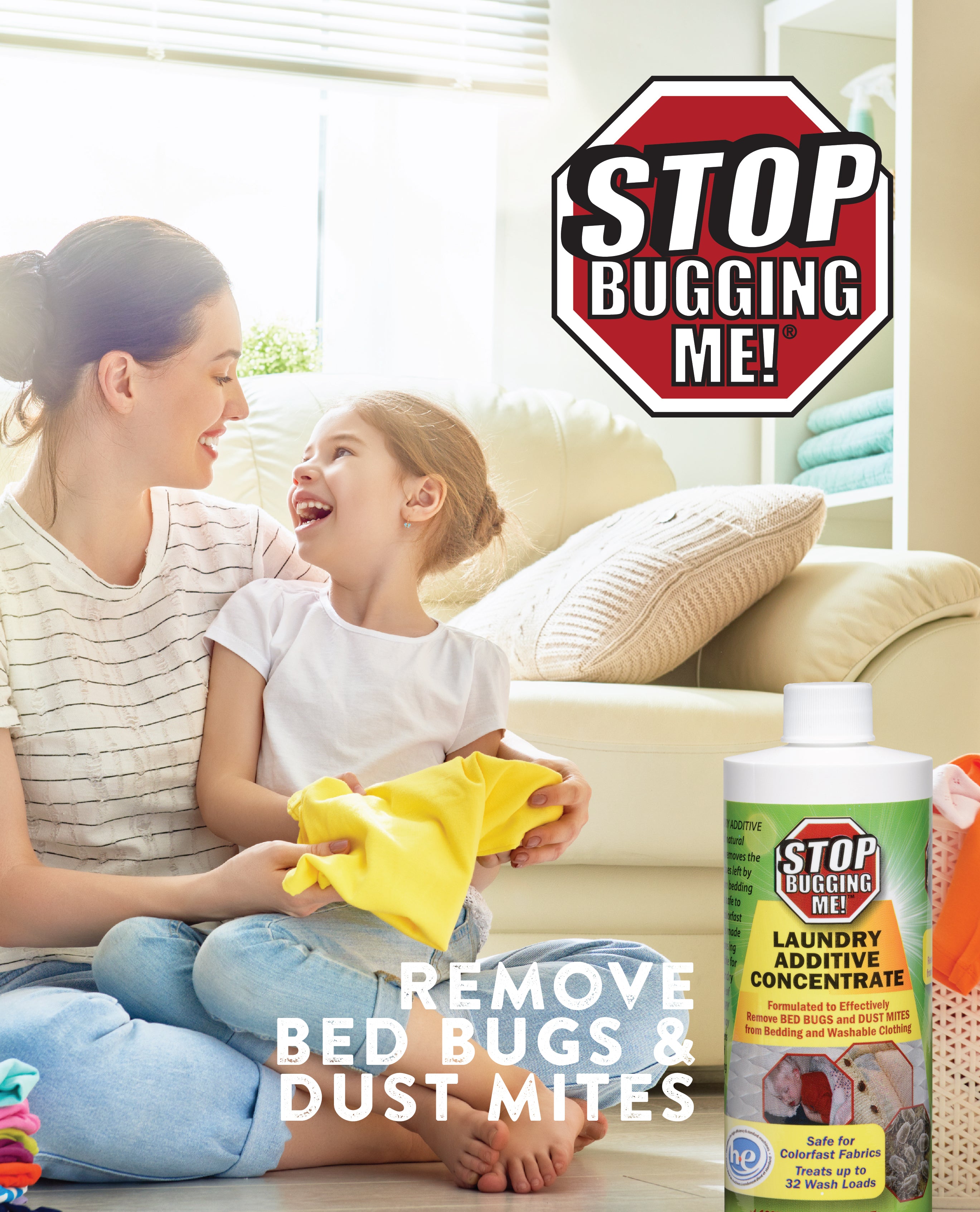 Stop Bugging Me!® Laundry Additive Concentrate effectively removes dust mites residue from bedding and washable clothing specially created for infestations when used as directed.